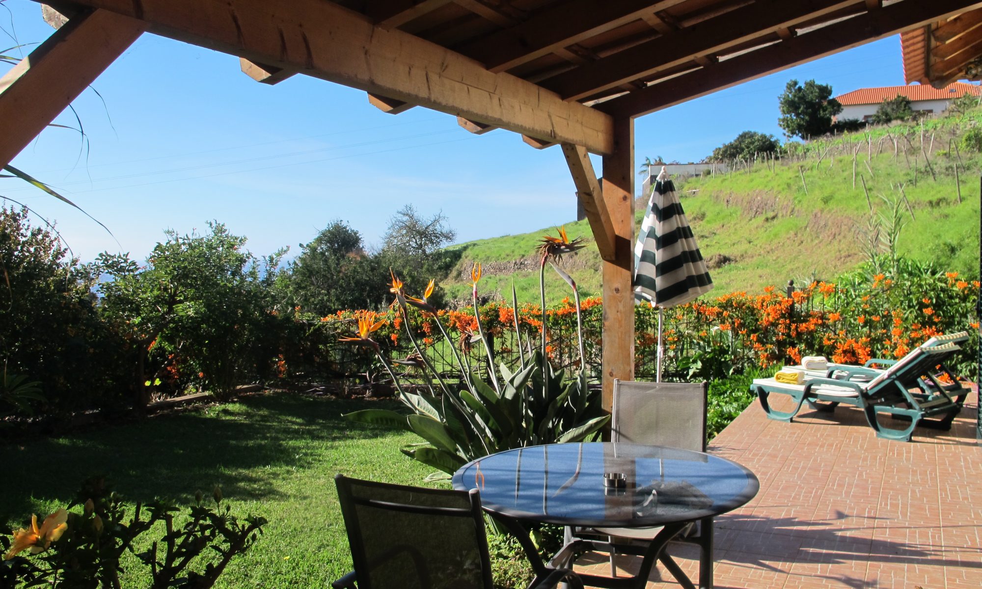 Alle Ferienhäuser haben eine private Terrasse mit einem Tisch, Stühlen und Sonnenliegen.